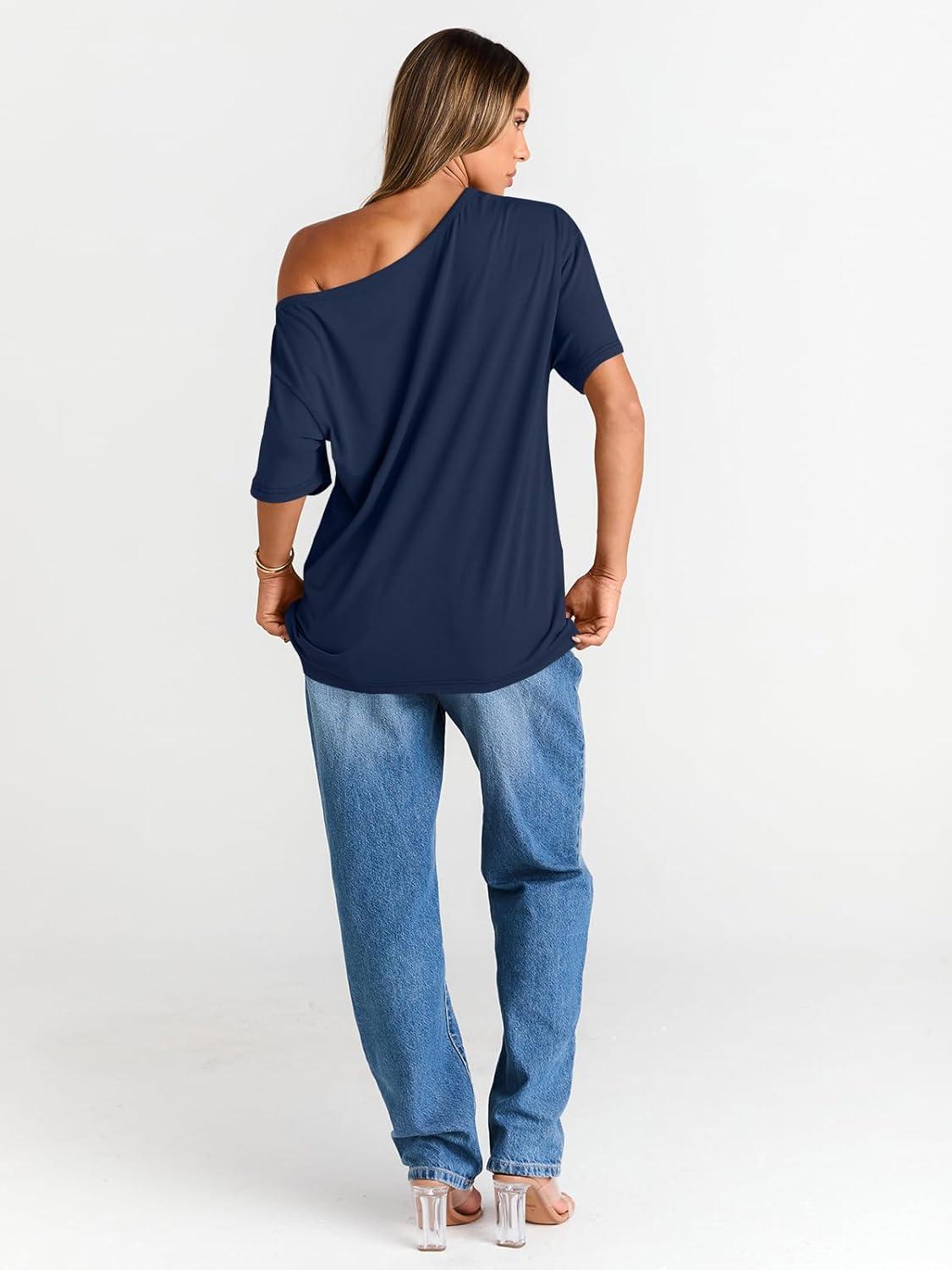 Trendy Queen Womens Off The Shoulder Tops Oversized T-Shirts Short Sleeve Tees Summer 2026 Casual Spring Fashion Clothes(Navy)