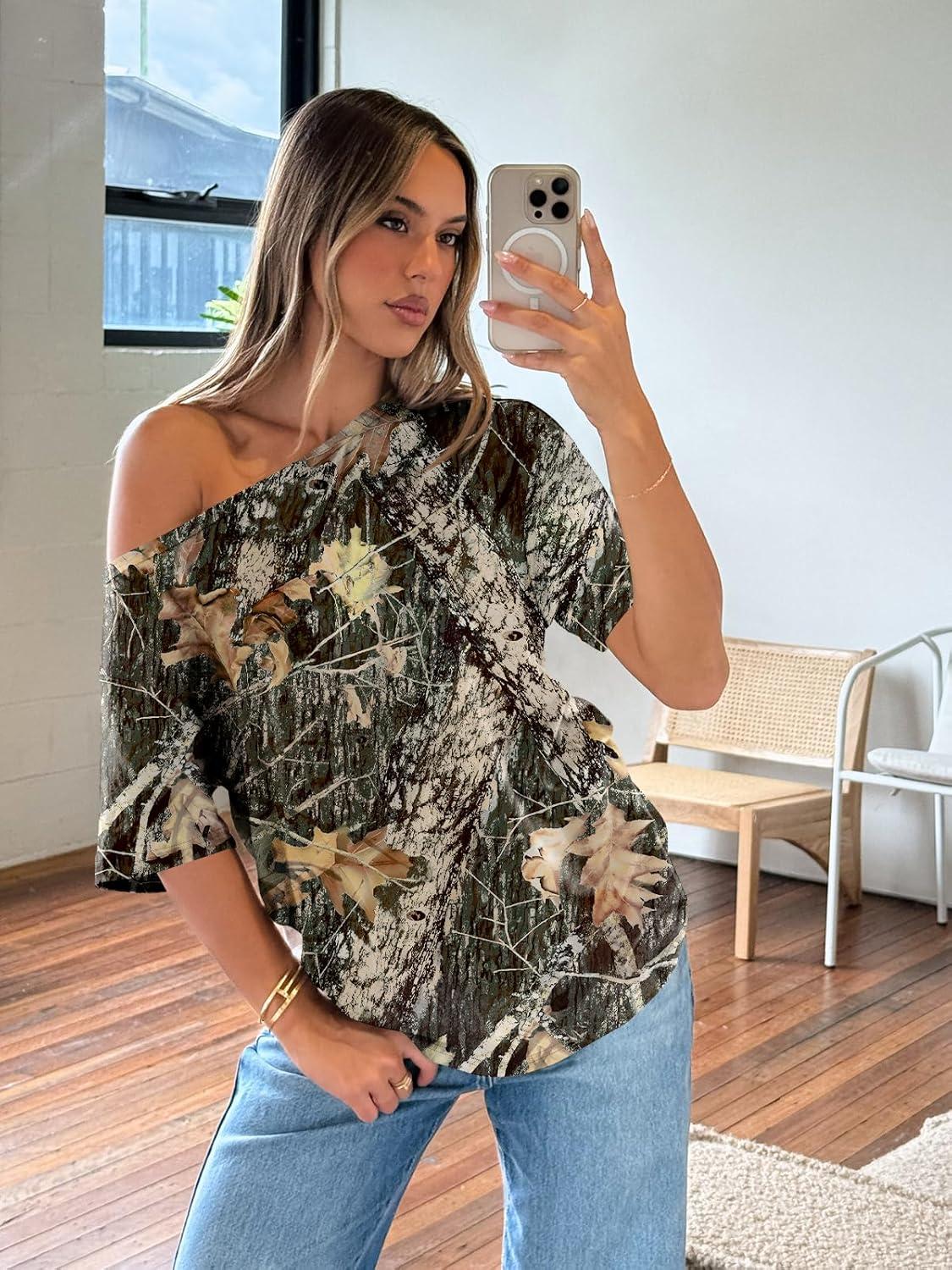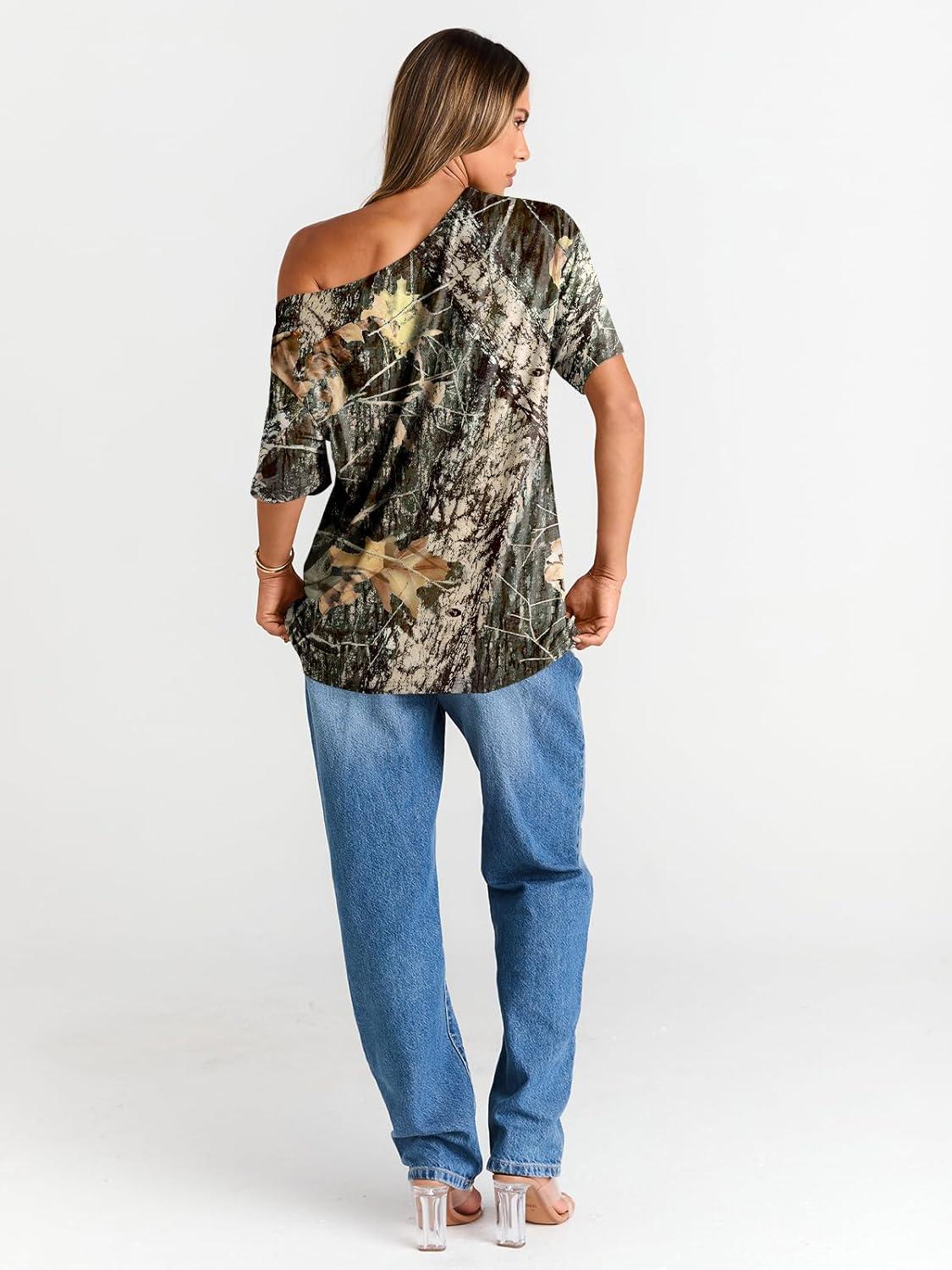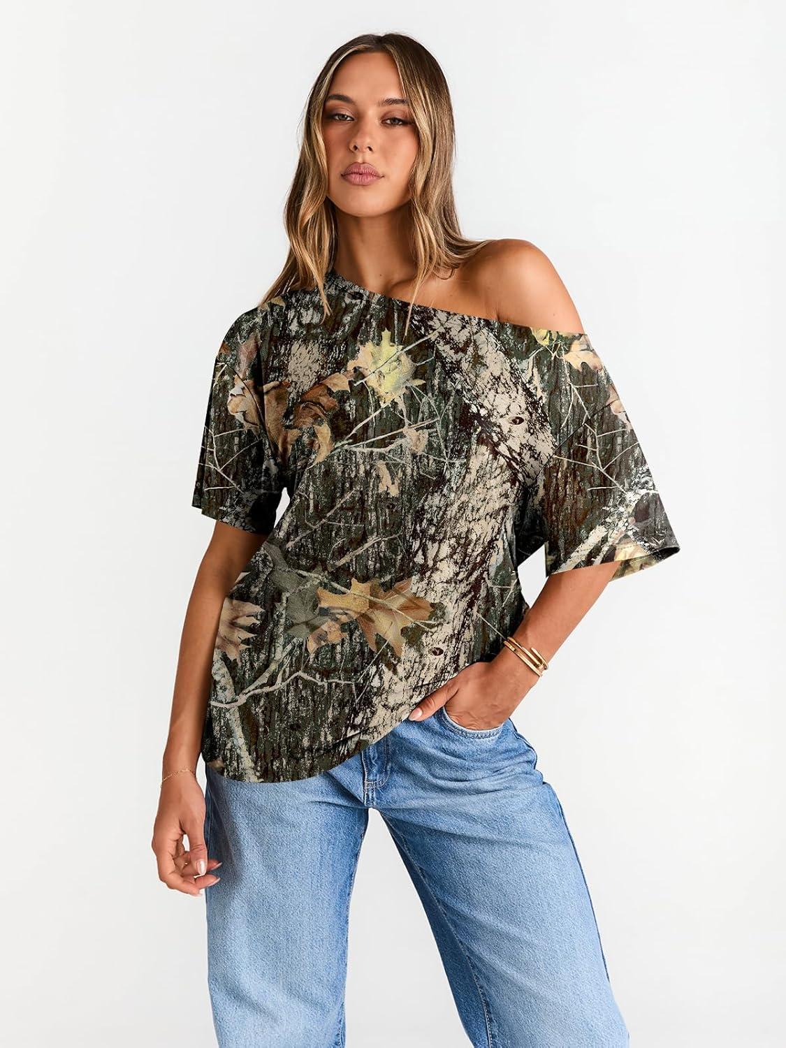 Trendy Queen Womens Off The Shoulder Tops Oversized T-Shirts Short Sleeve Tees Summer 2026 Casual Spring Fashion Clothes(Printeddarkgreen)