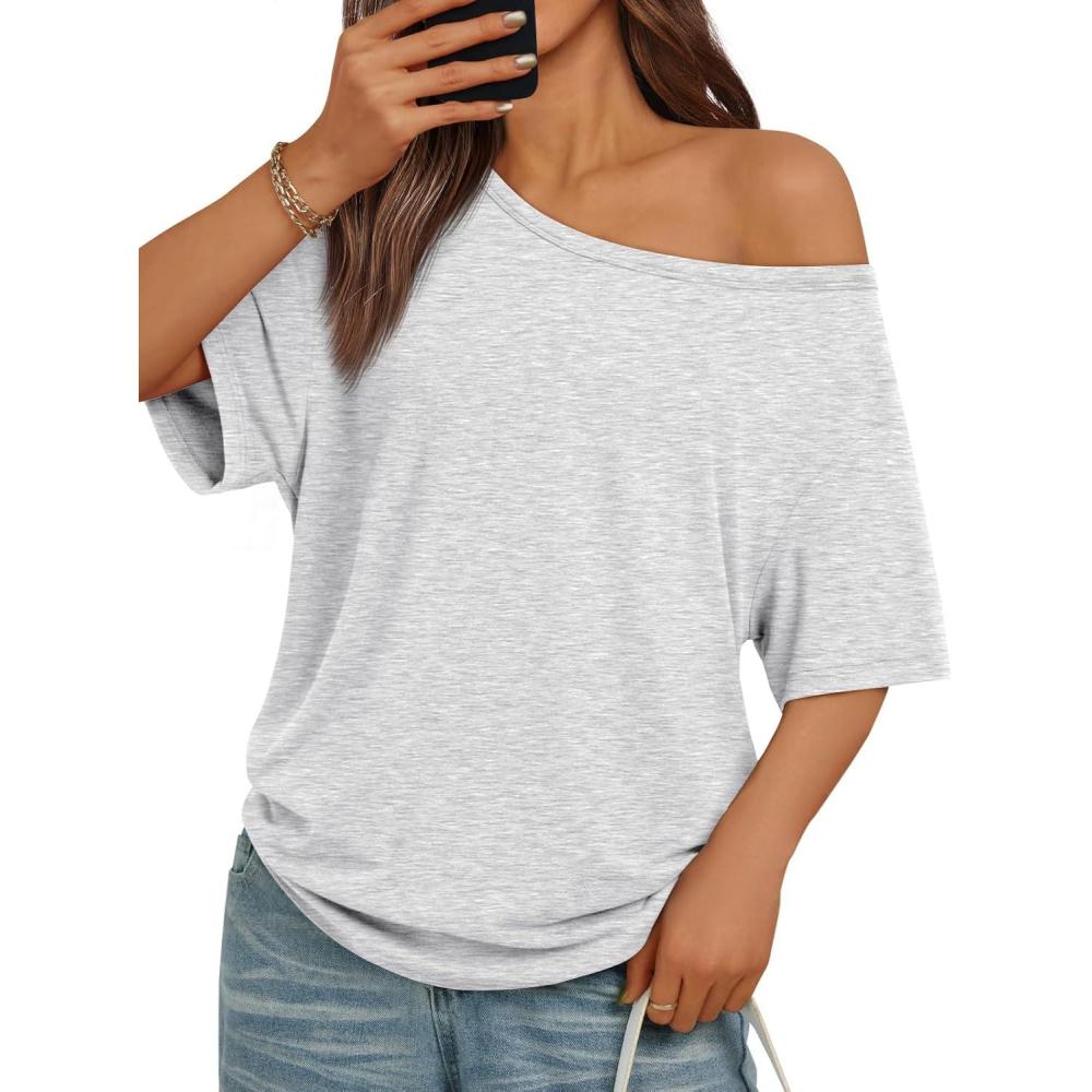 Trendy Queen Womens Off The Shoulder Tops Oversized Tshirts Casual Short Sleeve Basic Tees Cute Summer Fashion Clothes 2026(Oatmeal Grey)