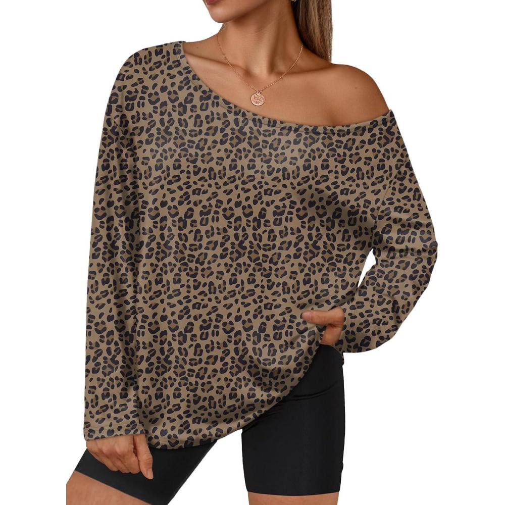 Trendy Queen Womens Off The Shoulder Tops Oversized Tshirts Long Sleeve 2025 Casual Basic Tees(Leopard)