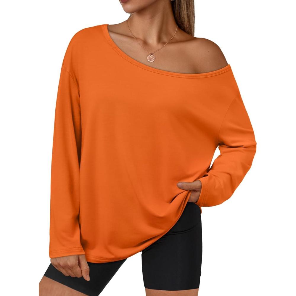 Trendy Queen Womens Off The Shoulder Tops Oversized Tshirts Long Sleeve 2025 Casual Basic Tees(Orange)