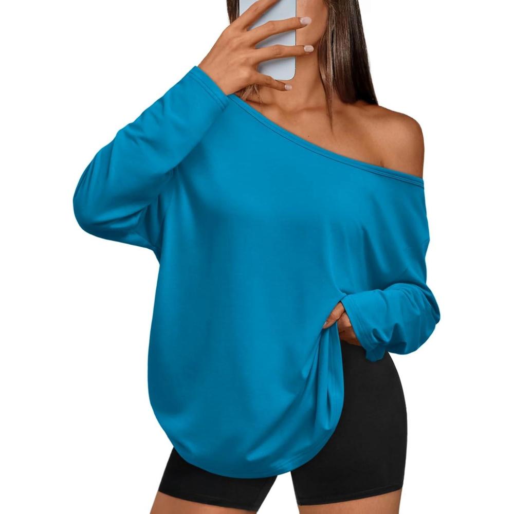 Trendy Queen Womens Off The Shoulder Tops Oversized Tshirts Long Sleeve 2025 Casual Basic Tees(Royal Blue)