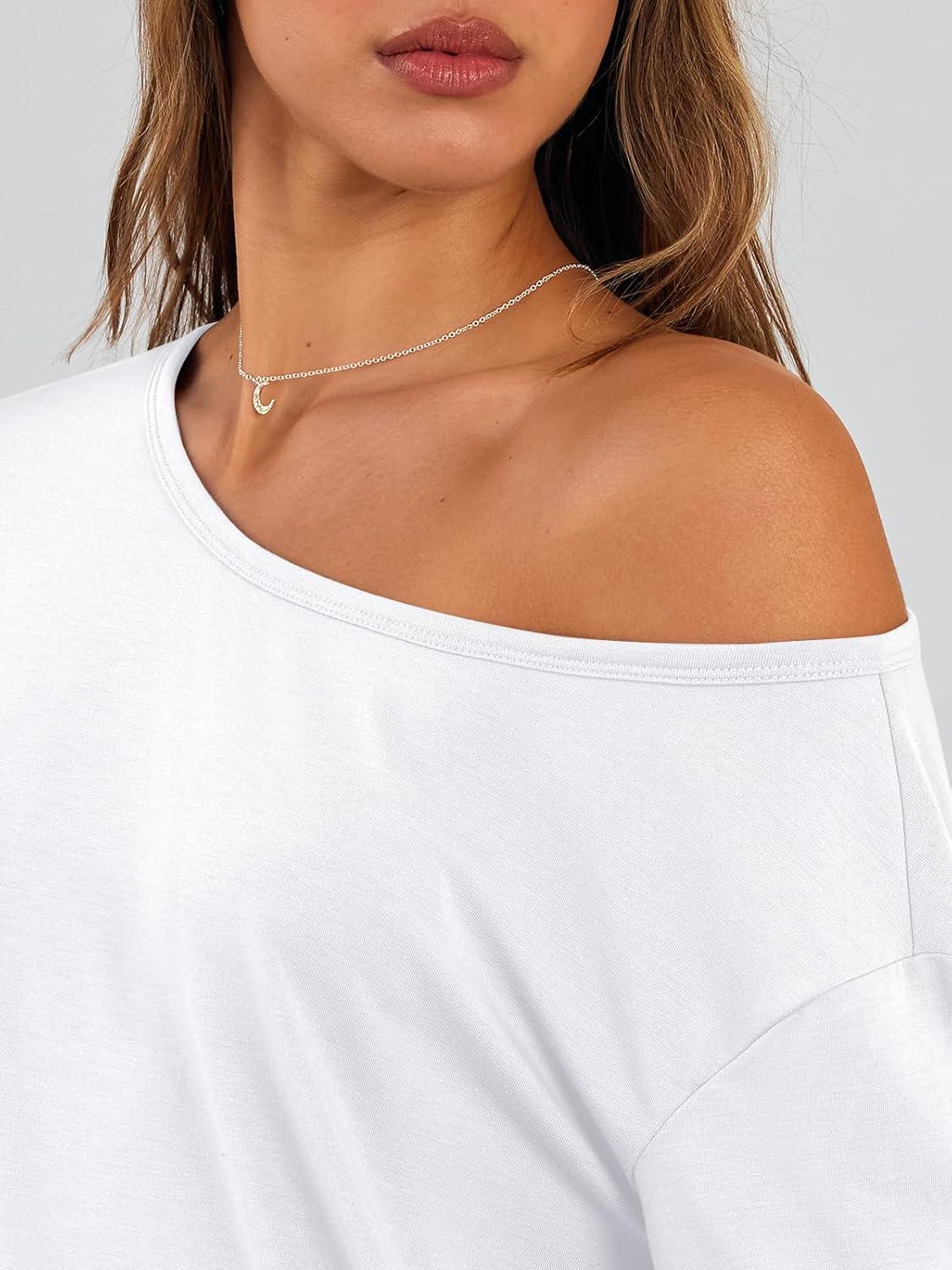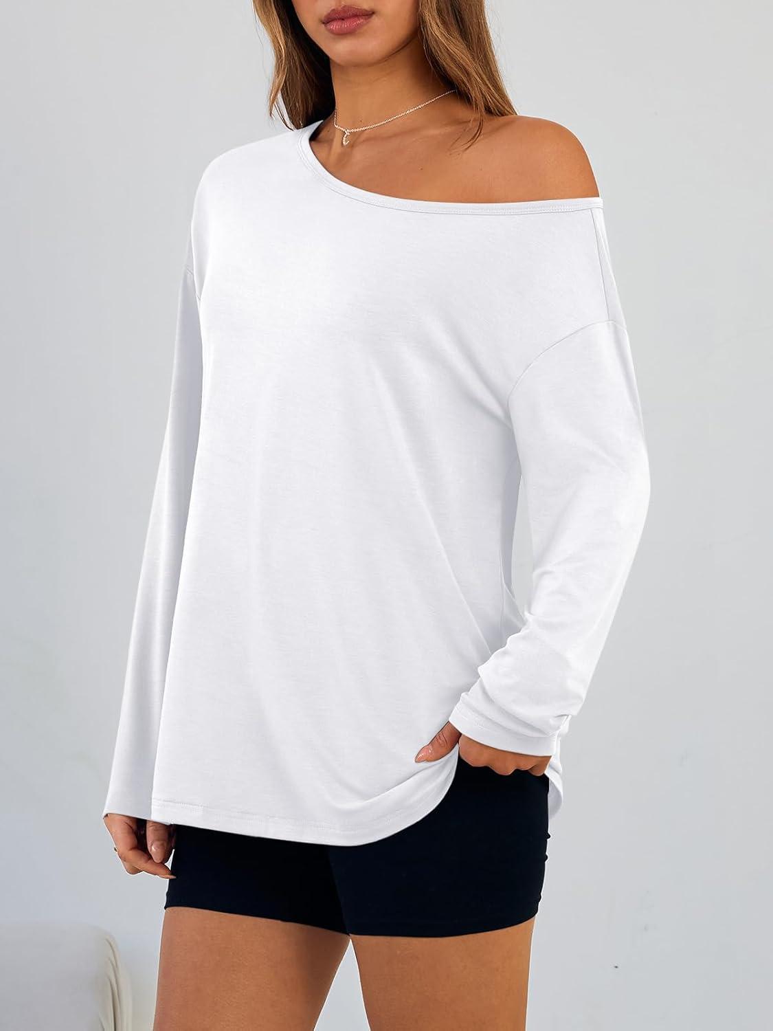 Trendy Queen Womens Off The Shoulder Tops Oversized Tshirts Long Sleeve 2025 Casual Basic Tees(White)