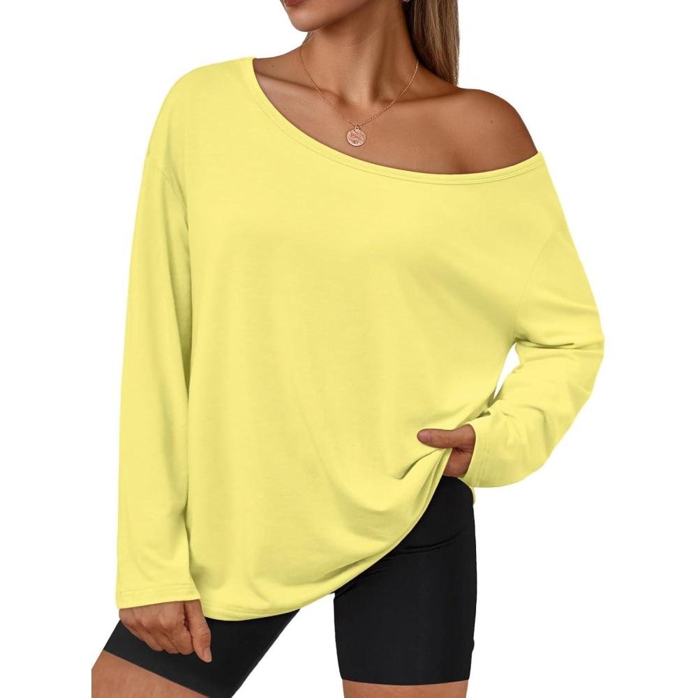Trendy Queen Womens Off The Shoulder Tops Oversized Tshirts Long Sleeve 2025 Casual Basic Tees(Yellow)