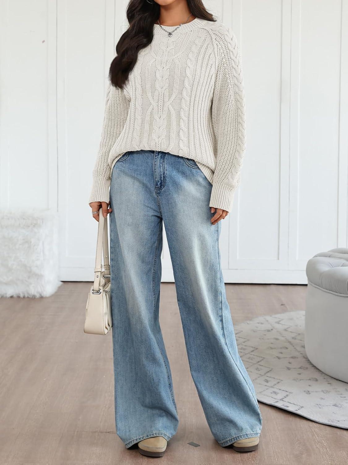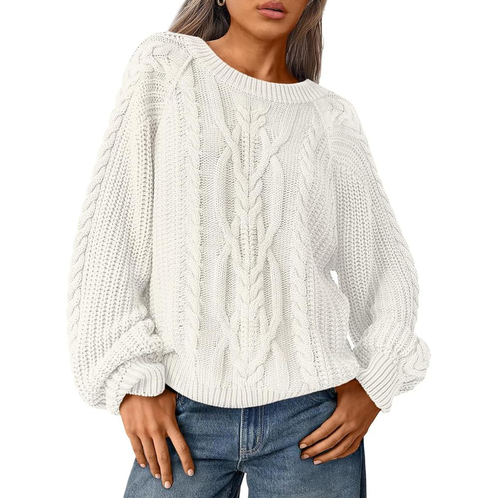 Trendy Queen Women’s Oversized Cable Knit Crewneck Fall Pullover Sweaters(White)