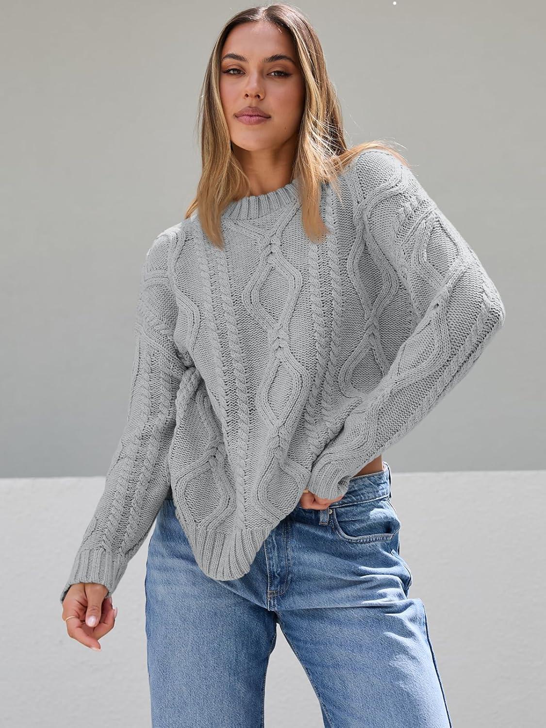 Trendy Queen Women’s Oversized Cable Knit Crewneck Sweaters(Heather Grey)