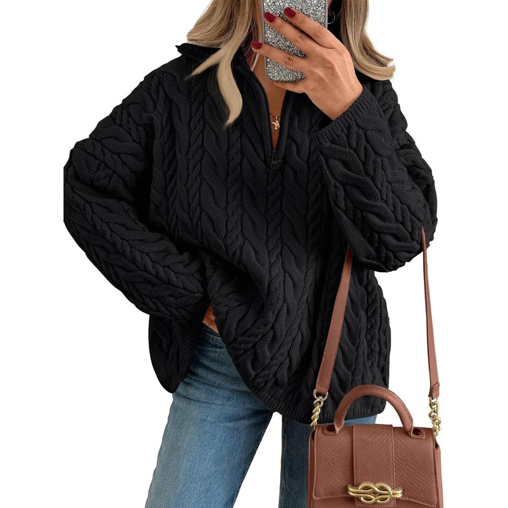 Trendy Queen Women’s Oversized Cable Knit Quarter Zip Up Pullover Sweaters(Black)