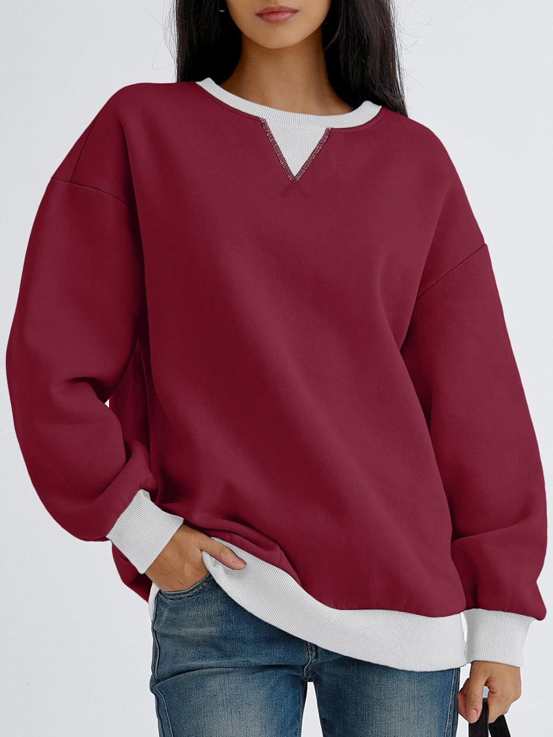 Trendy Queen Women’s Oversized Color Block Fleeced Crewneck Sweatshirt(Maroon)