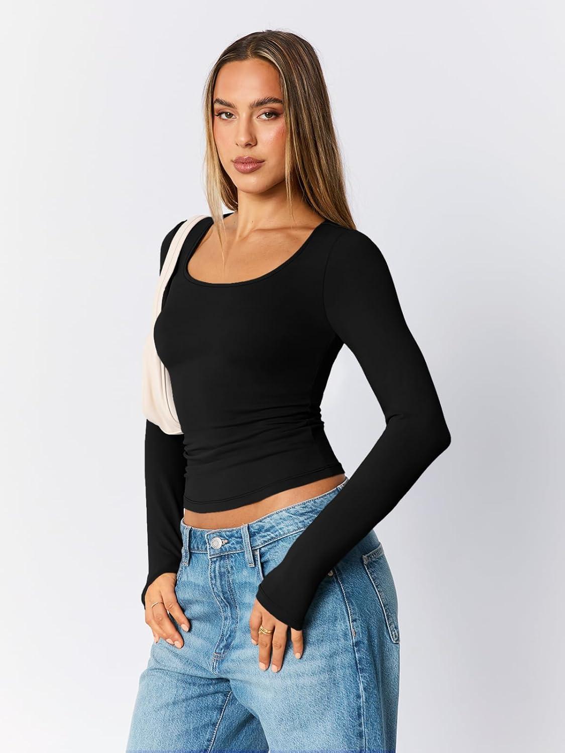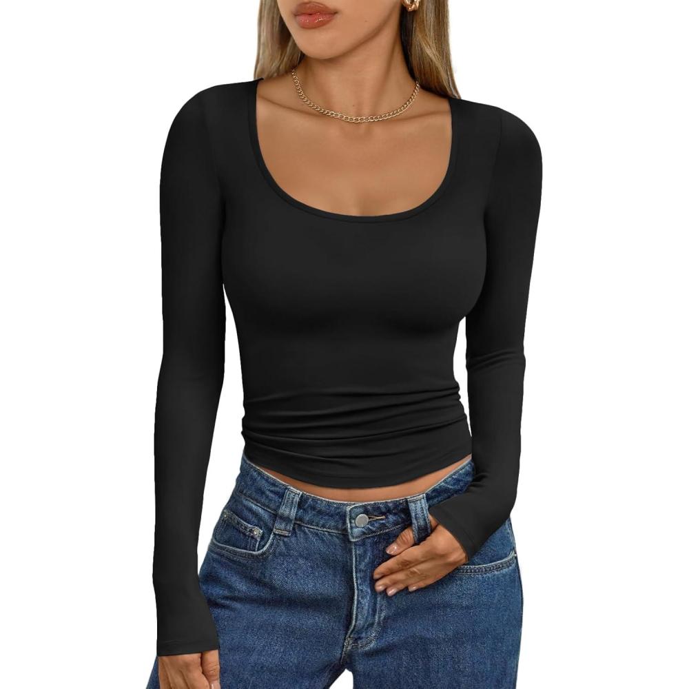 Trendy Queen Womens Scoop Neck Long Sleeve Shirts Skinny Going Out Crop Tops Cute Fall Fashion 2025 Clothes(Black)