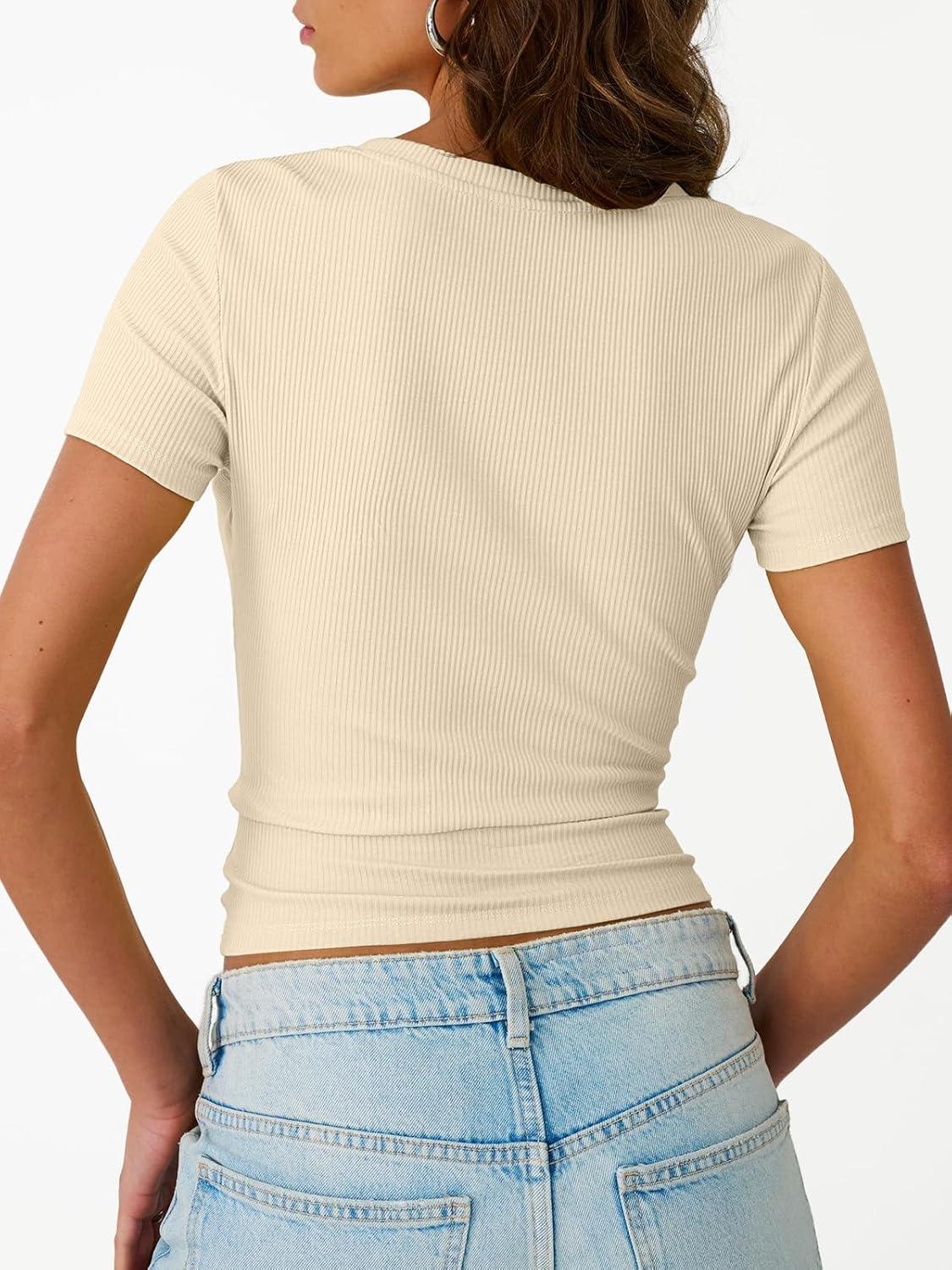 Be the first to review “Trendy Queen Womens Short Sleeve Shirts Crewneck Ribbed Knit Slim Fitted T-Shirt Summer Basic Tee 2025 Tops(Beige)”