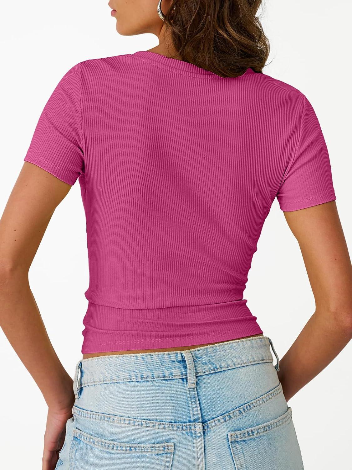 Be the first to review “Trendy Queen Womens Short Sleeve Shirts Crewneck Ribbed Knit Slim Fitted T-Shirt Summer Basic Tee 2025 Tops(Hot Pink)”
