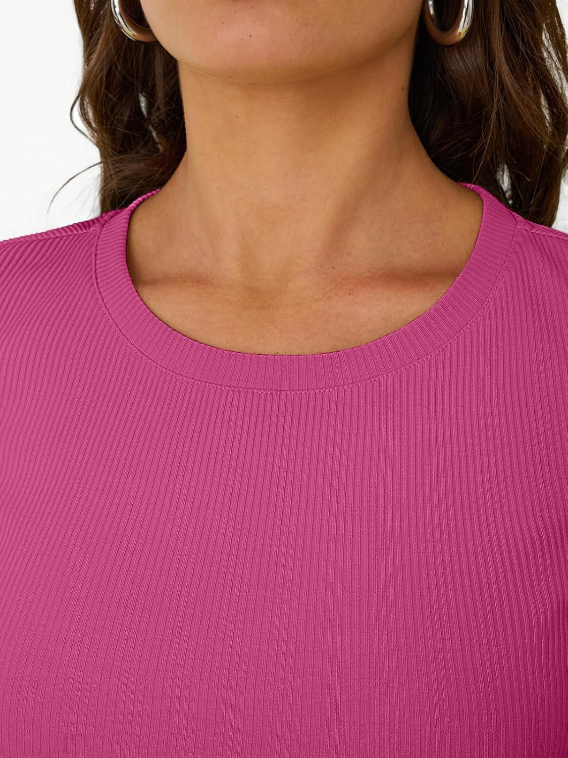 Trendy Queen Womens Short Sleeve Shirts Crewneck Ribbed Knit Slim Fitted T-Shirt Summer Basic Tee 2025 Tops(Hot Pink)