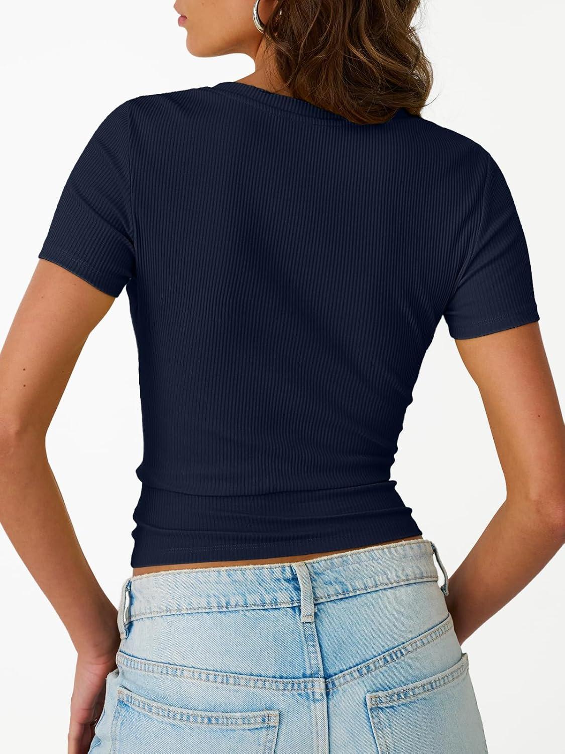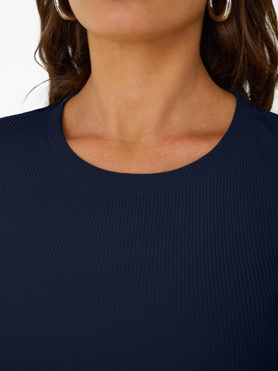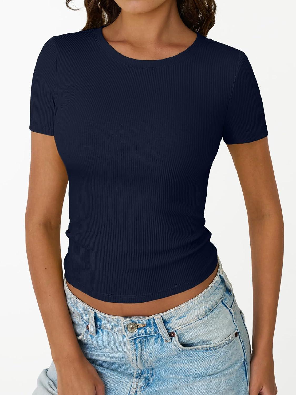 Trendy Queen Womens Short Sleeve Shirts Crewneck Ribbed Knit Slim Fitted T-Shirt Summer Basic Tee 2025 Tops(Navy Blue)