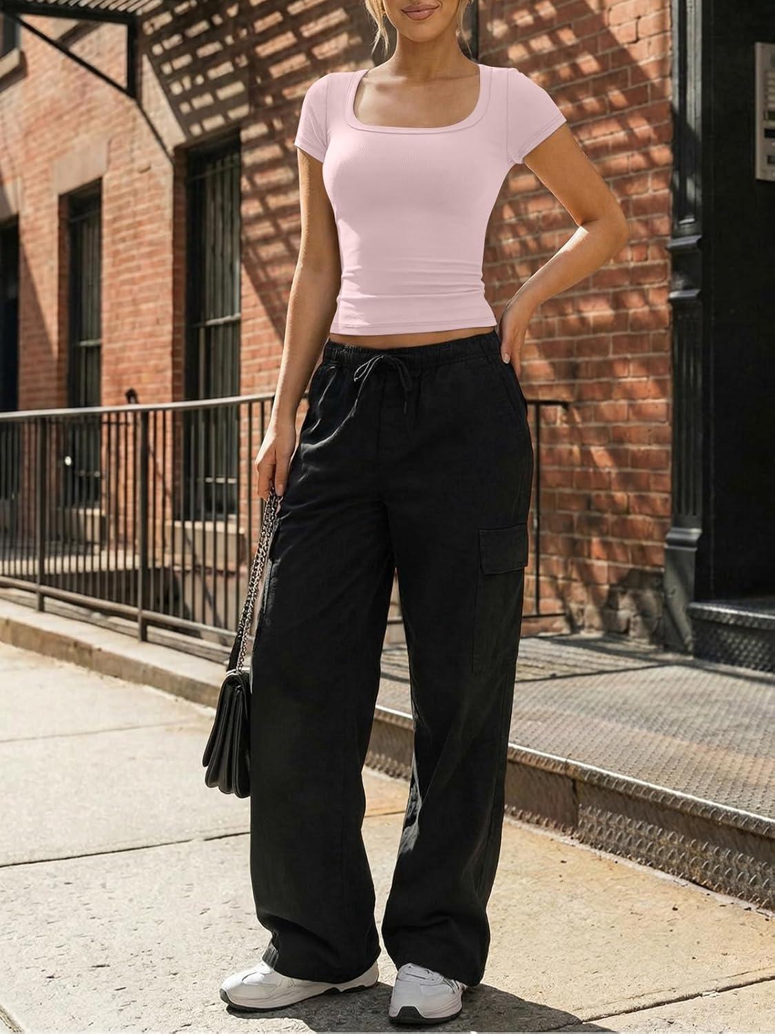 Be the first to review “Trendy Queen Womens Short Sleeve Square Neck Basic T Shirts Slim Fit Crop Y2k Tee(Pink)”