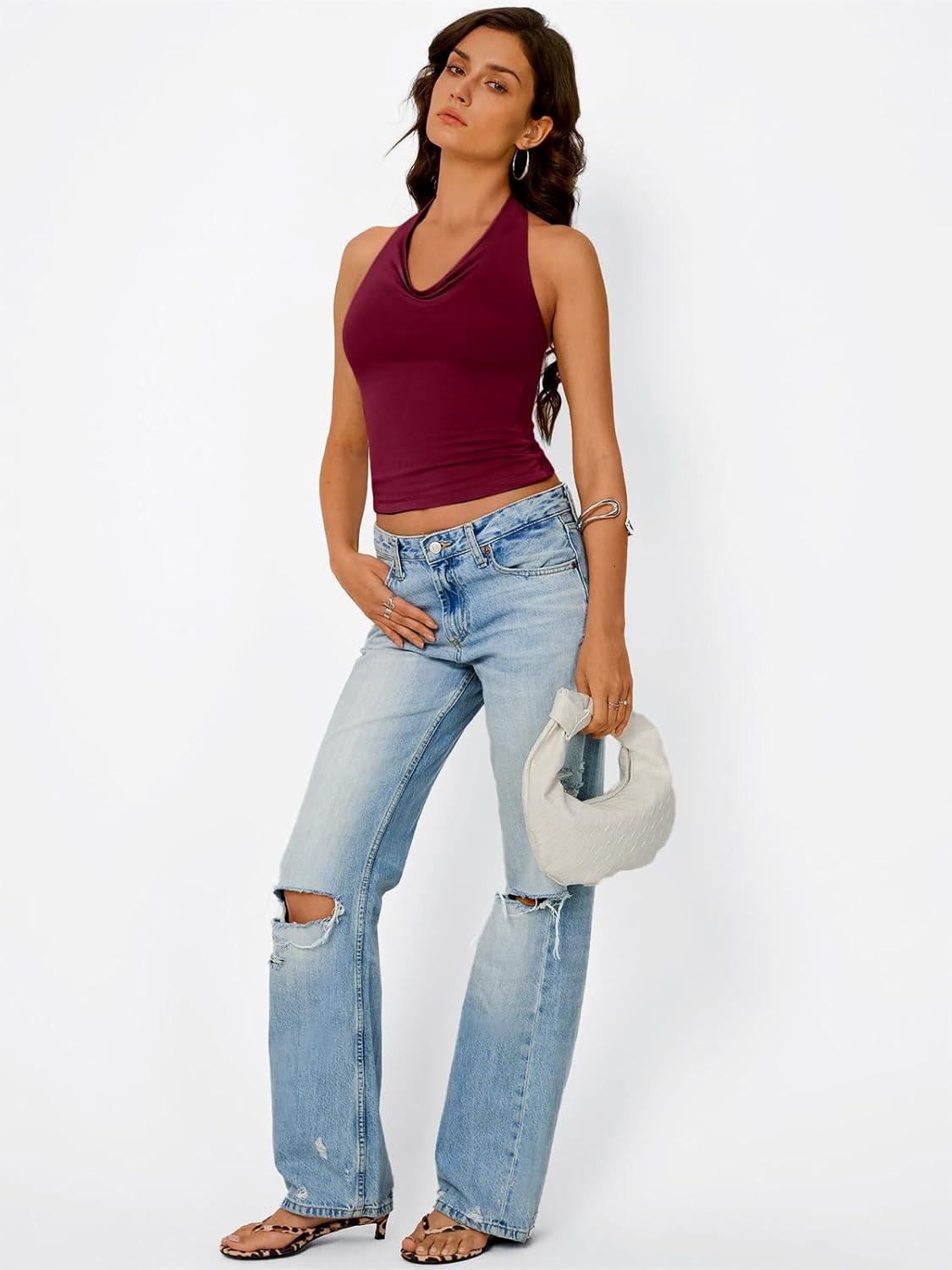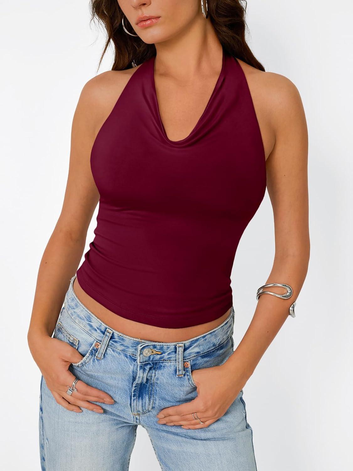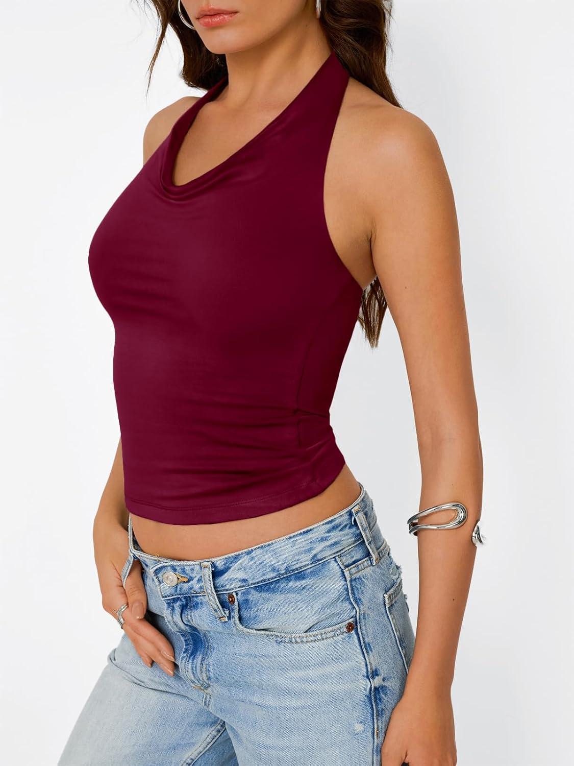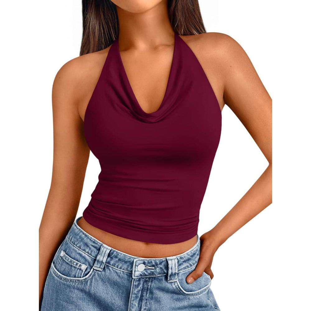 Trendy Queen Womens Summer Halter Tops Going Out Crop Top 2025 Fashion Cowl Neck Shirts Backless Sexy Cute Y2K Clothes(Winered)