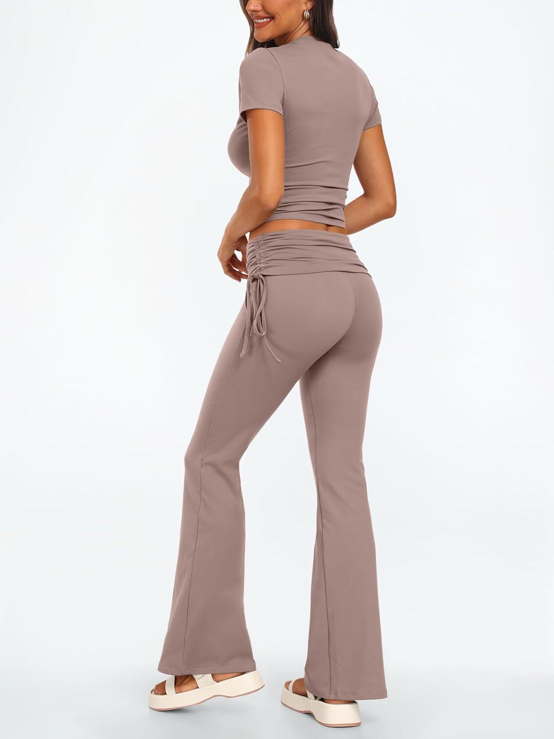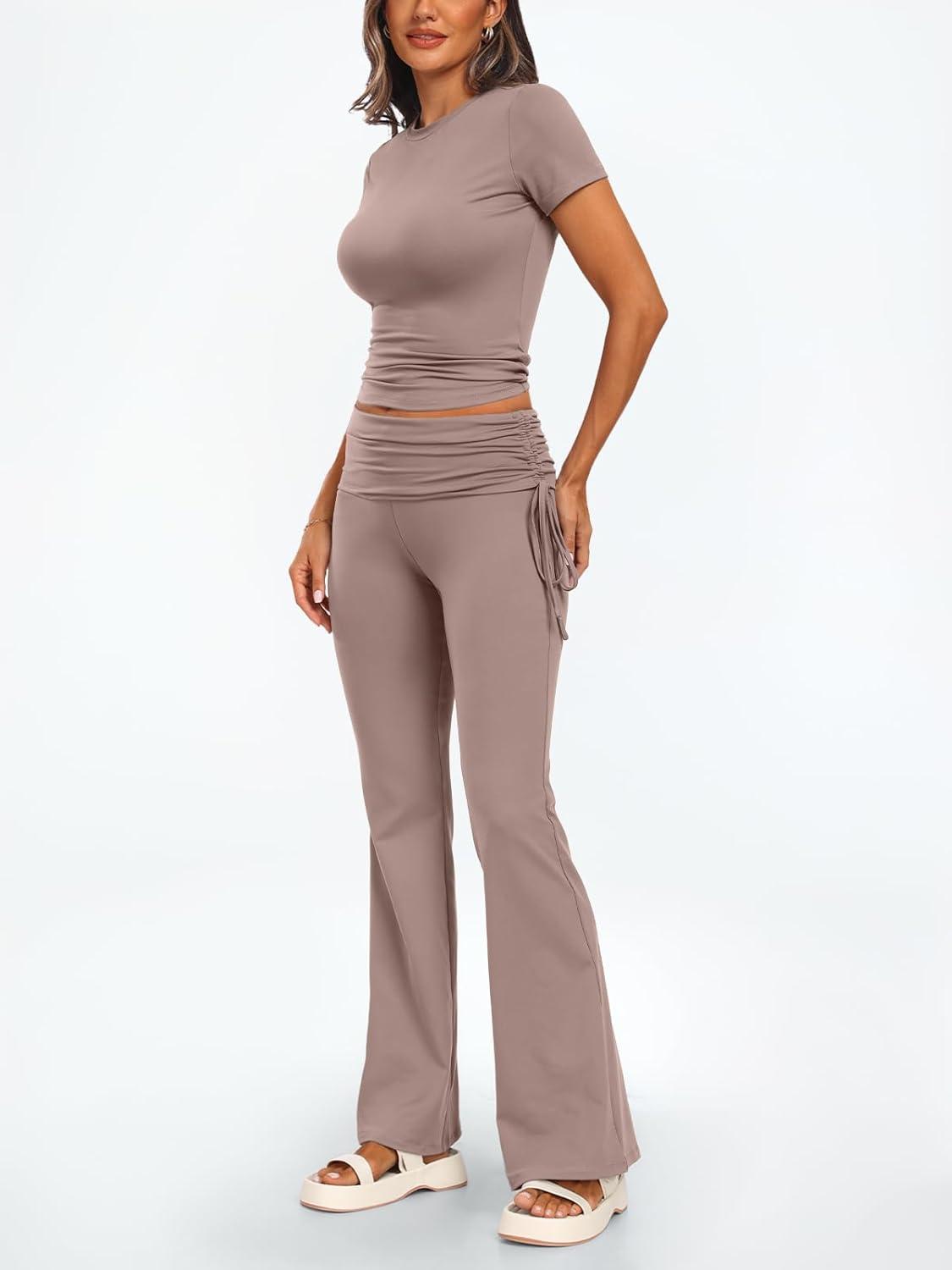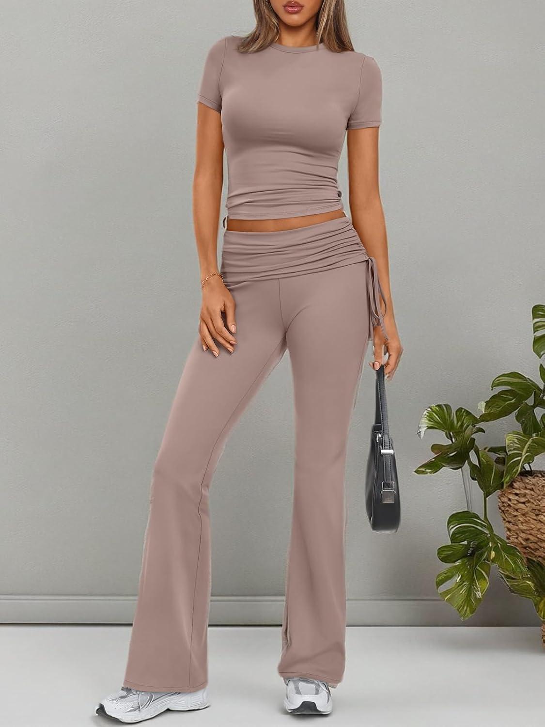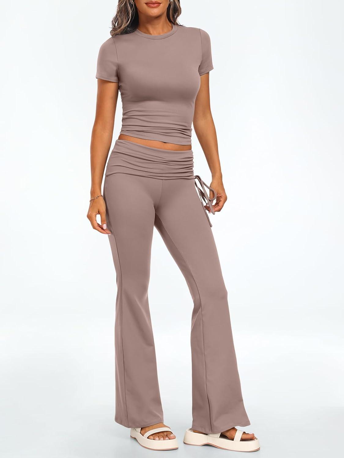 Trendy Queen womens Summer Two Piece Sets 2 Piece Lounge Sets Outfits Matching Pajamas Joggers Casual Y2k Trendy Tracksuits Travel Tops Drawstring Flare Pants 2024 Clothes, Small, Coffeegrey