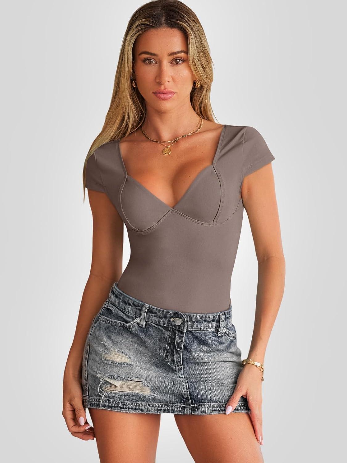 Trendy Queen Womens Summer V-Neck Backless Cute Tops Going Out Sexy Slim T-Shirts Y2K Clothes Corset Spring Outfits 2026(Coffee Grey)