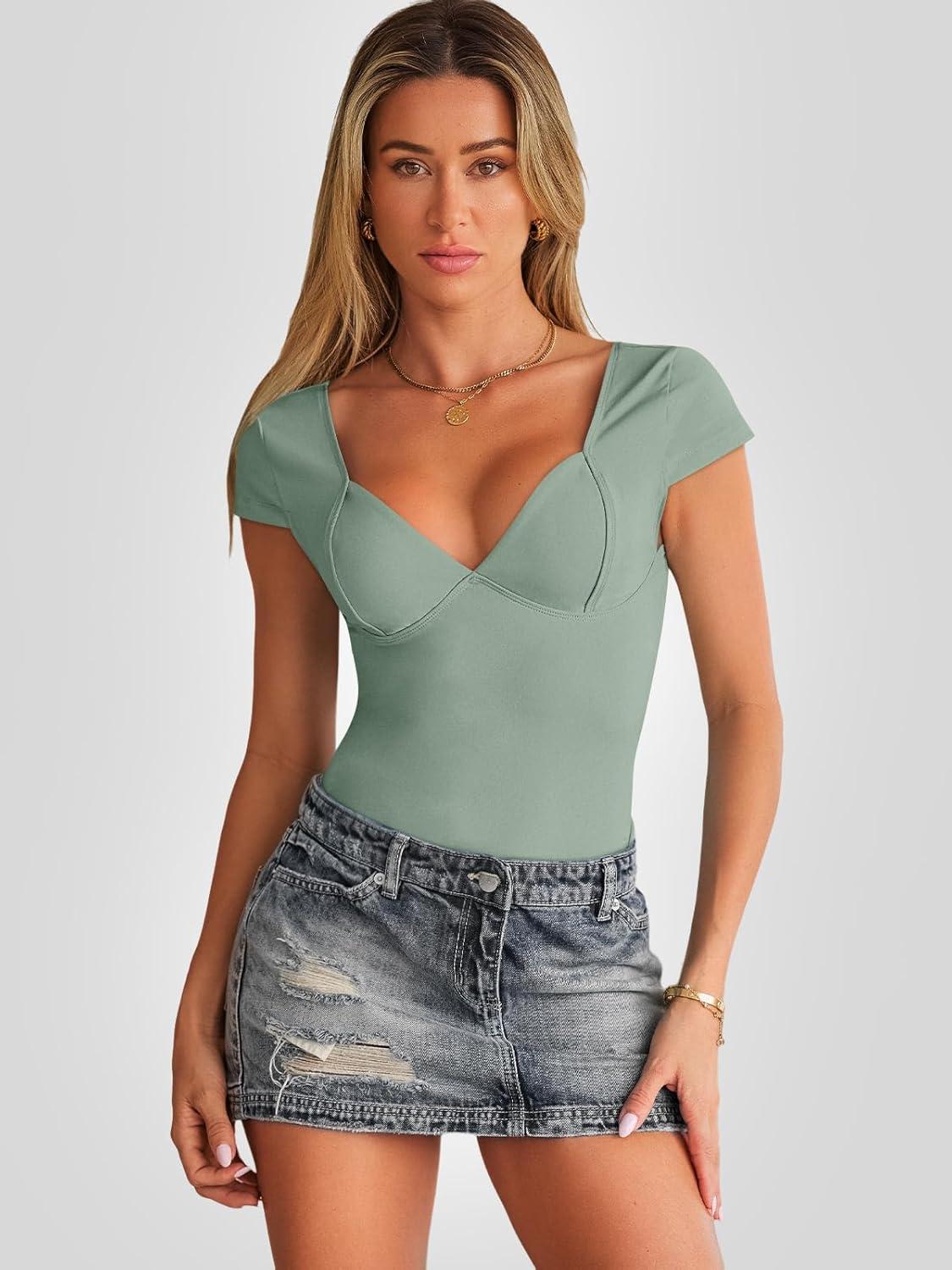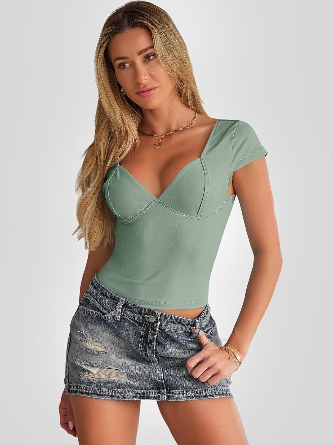 Trendy Queen Womens Summer V-Neck Backless Cute Tops Going Out Sexy Slim T-Shirts Y2K Clothes Corset Spring Outfits 2026(Light Green)
