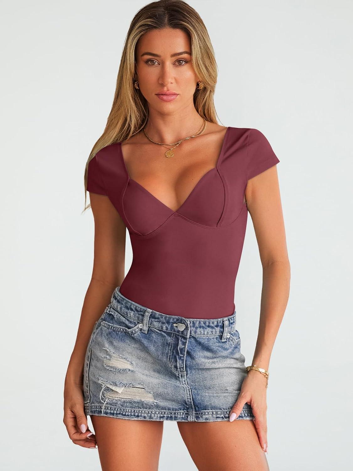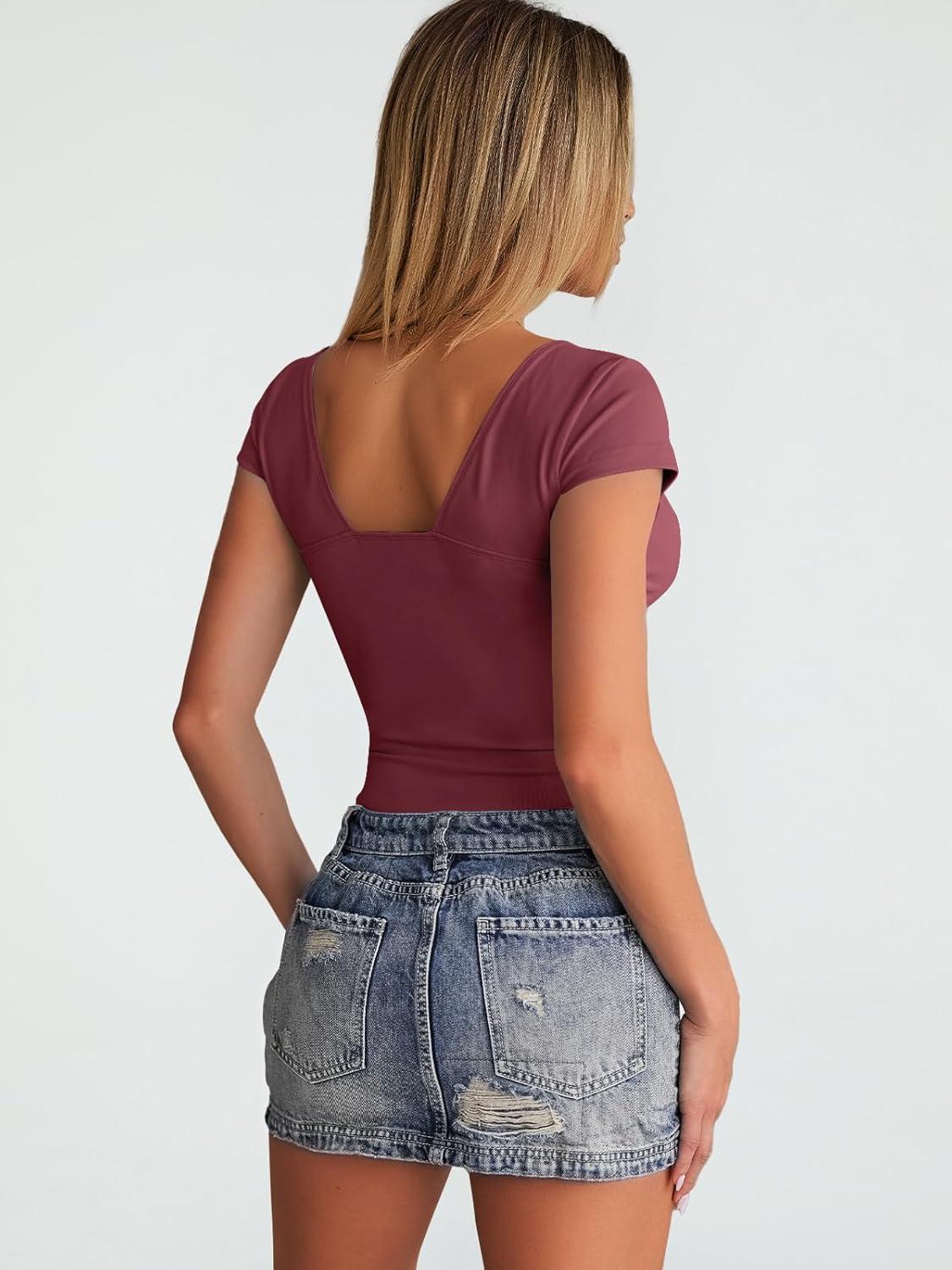 Trendy Queen Womens Summer V-Neck Backless Cute Tops Going Out Sexy Slim T-Shirts Y2K Clothes Corset Spring Outfits 2026(Wine Red)