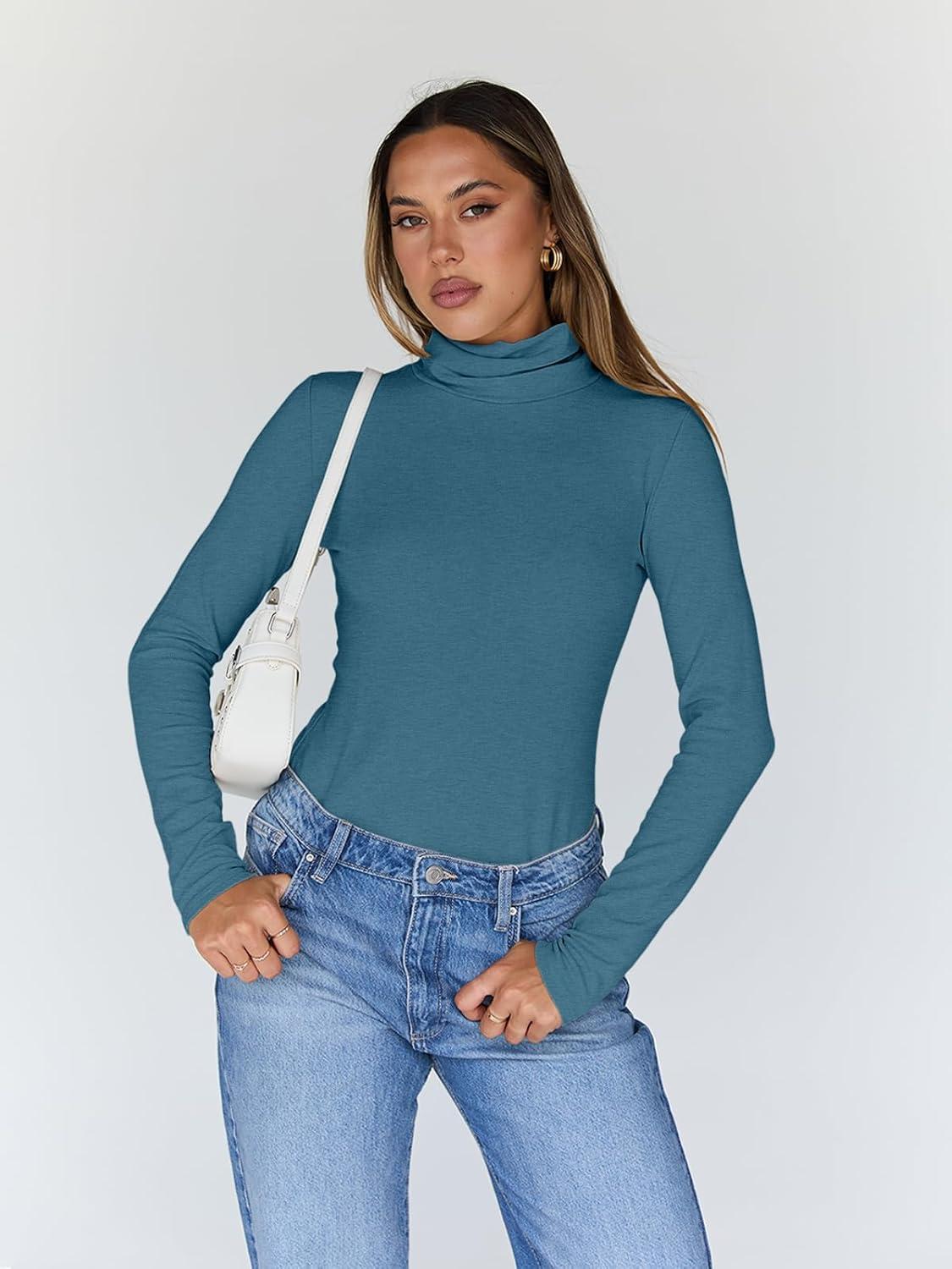 Trendy Queen Women's Turtleneck Long Sleeve Shirts Fall Fashion Basic Thermal Underwear Tops Winter Clothes 2025(Blue)