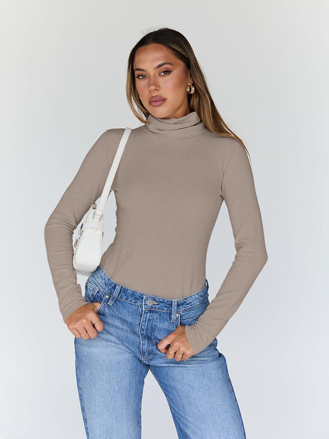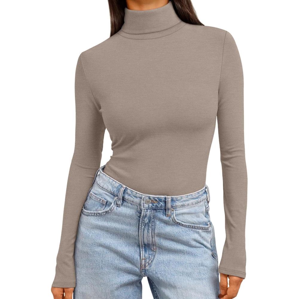 Trendy Queen Women’s Turtleneck Long Sleeve Shirts Spring Fashion Basic Thermal Underwear Tops Winter Clothes 2026(Light Brown)