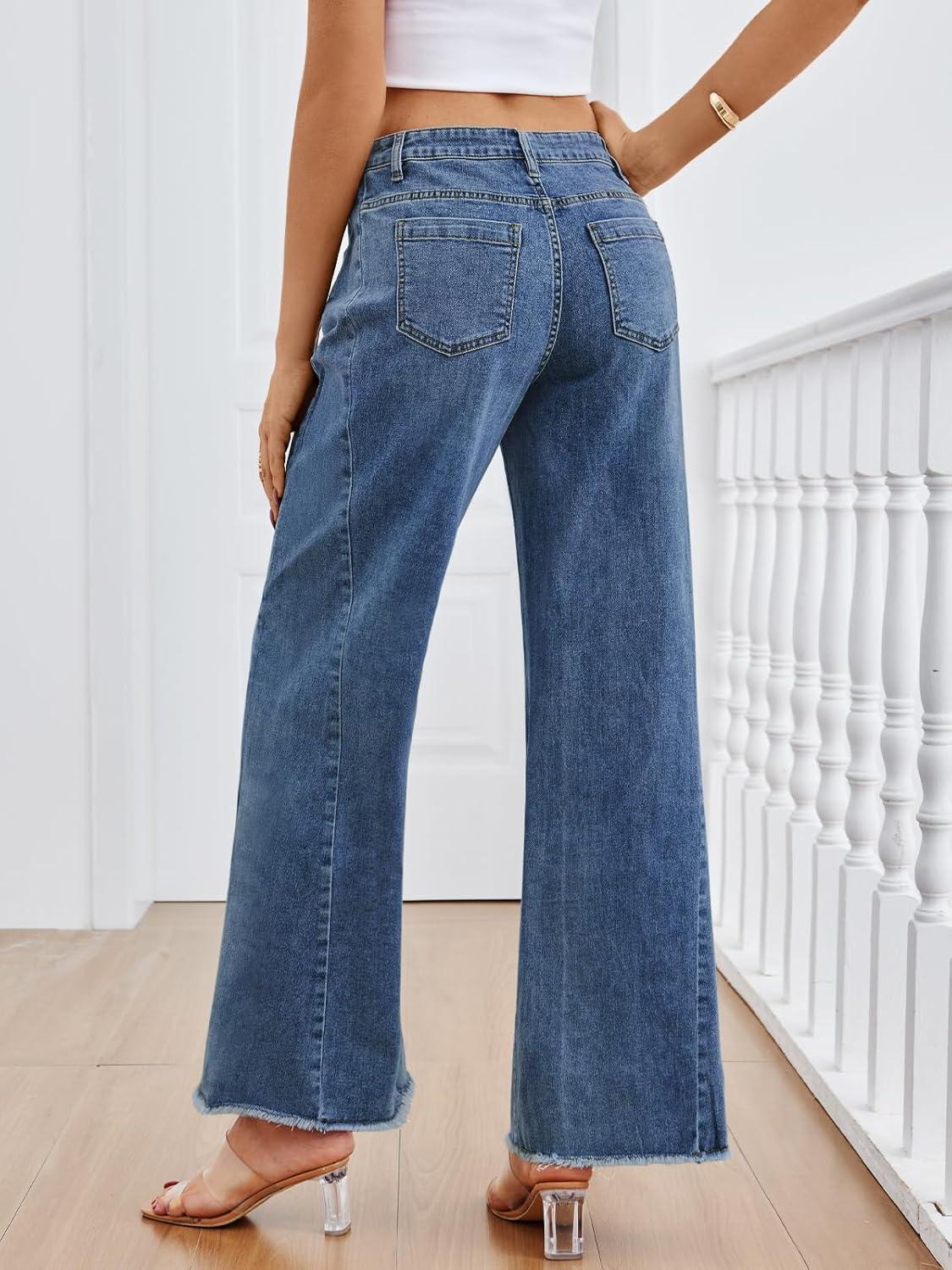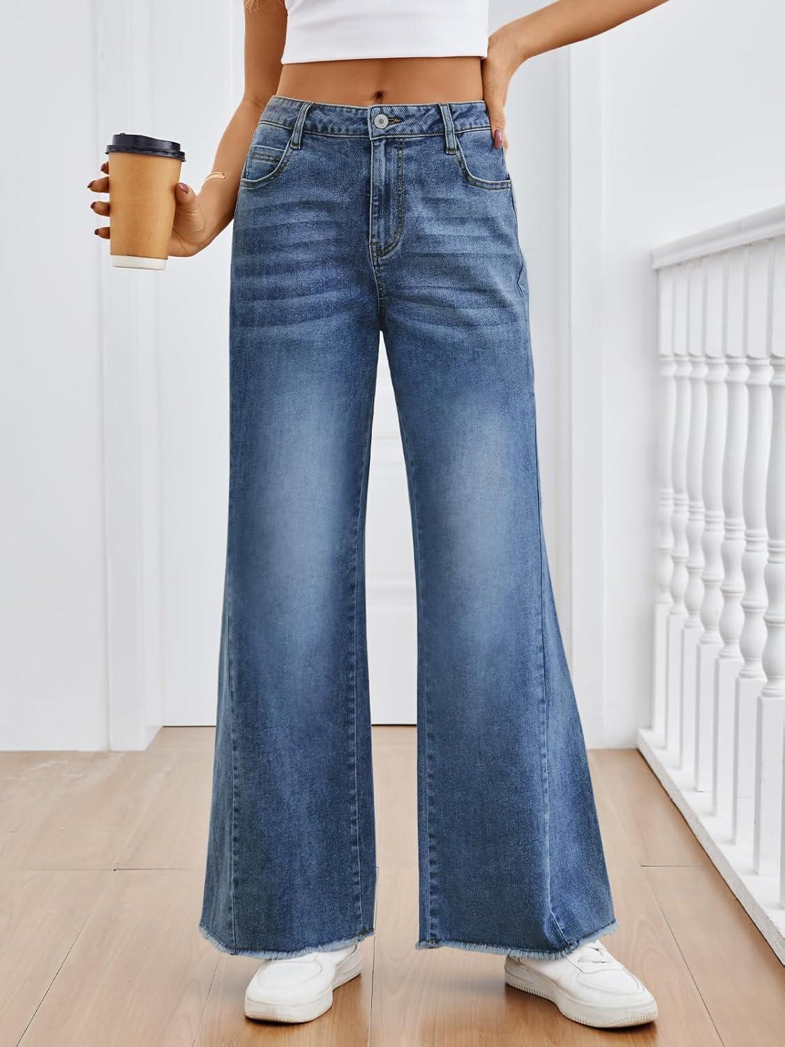 Trendy Queen Women's Wide Leg Jeans, Relaxed Loose Straight Leg with Raw Hem, Comfort Denim Pants(Blue)