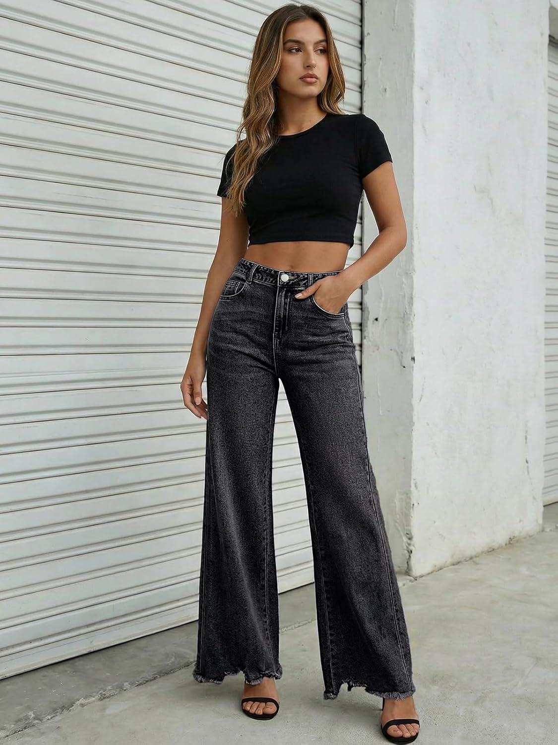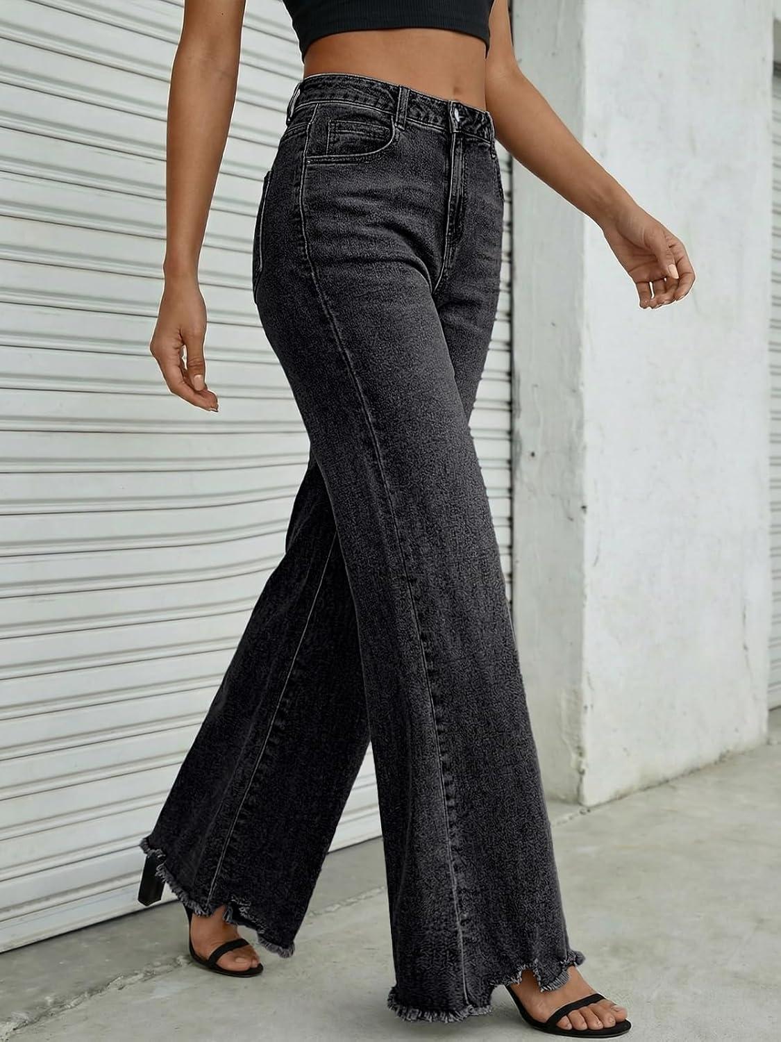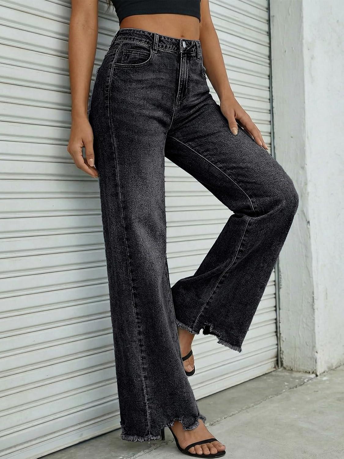 Trendy Queen Women's Wide Leg Jeans Stretchy High Waisted Straight Leg with Raw Hem Baggy Denim Pants(Black)