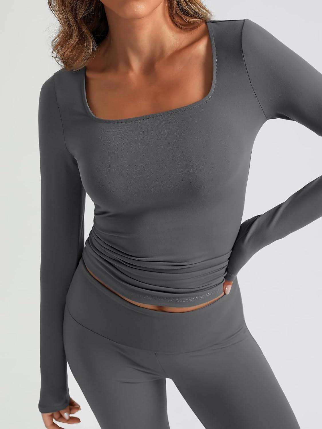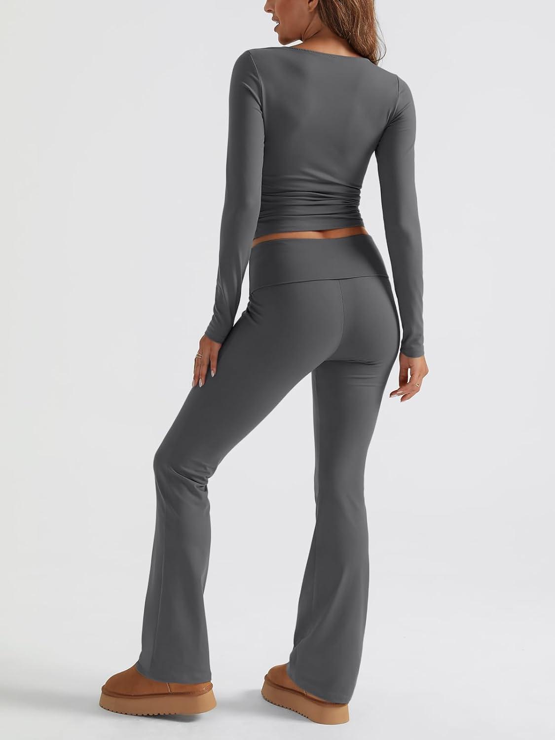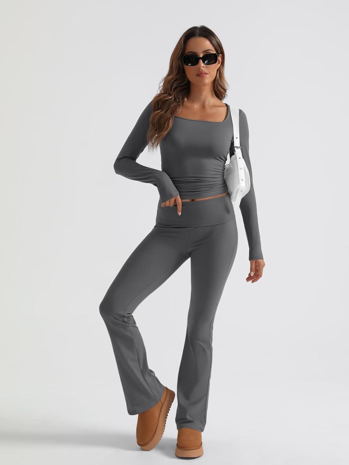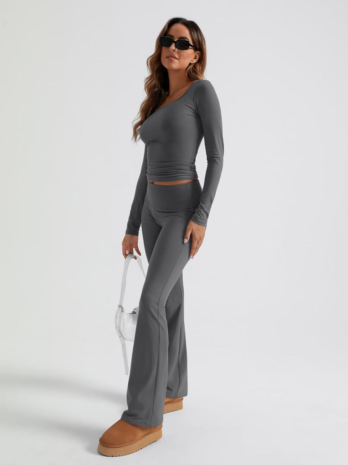 Trendy Queen Womens Workout Sets 2 Piece Fall Outfits Square Neck Tops Flare Pants Tracksuits Clothes Winter Fashion 2025(Darkgrey)