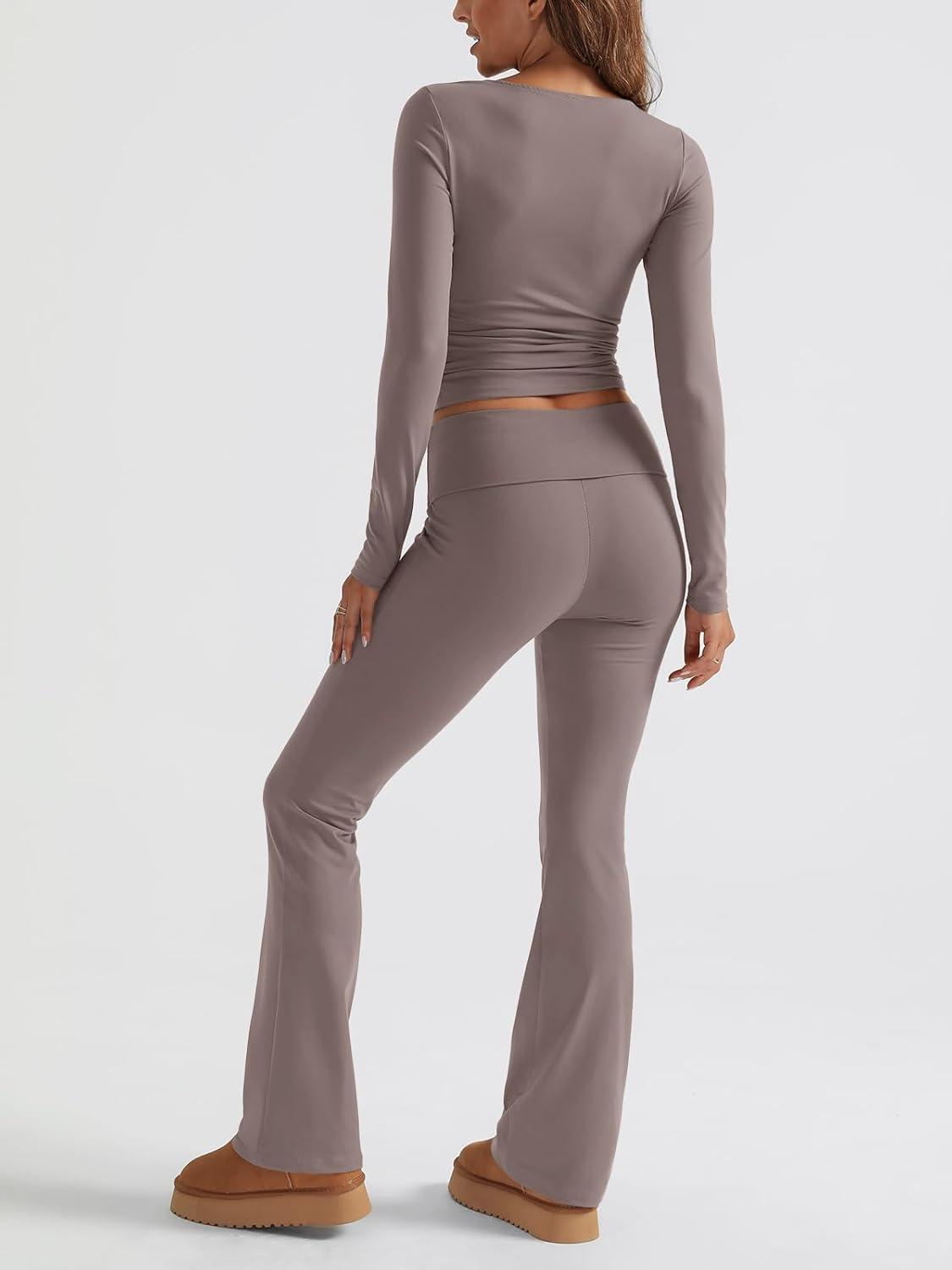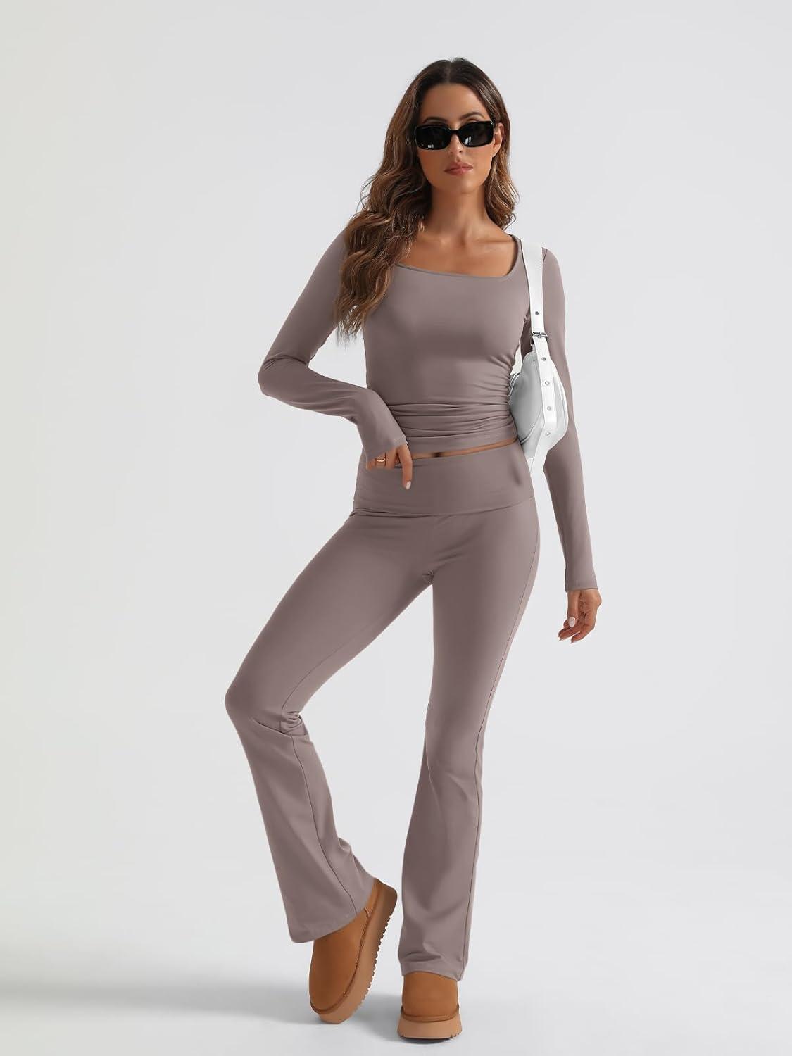 Trendy Queen Womens Workout Sets 2 Piece Fall Outfits Square Neck Tops Flare Pants Tracksuits Clothes Winter Fashion 2026(Coffeegrey)