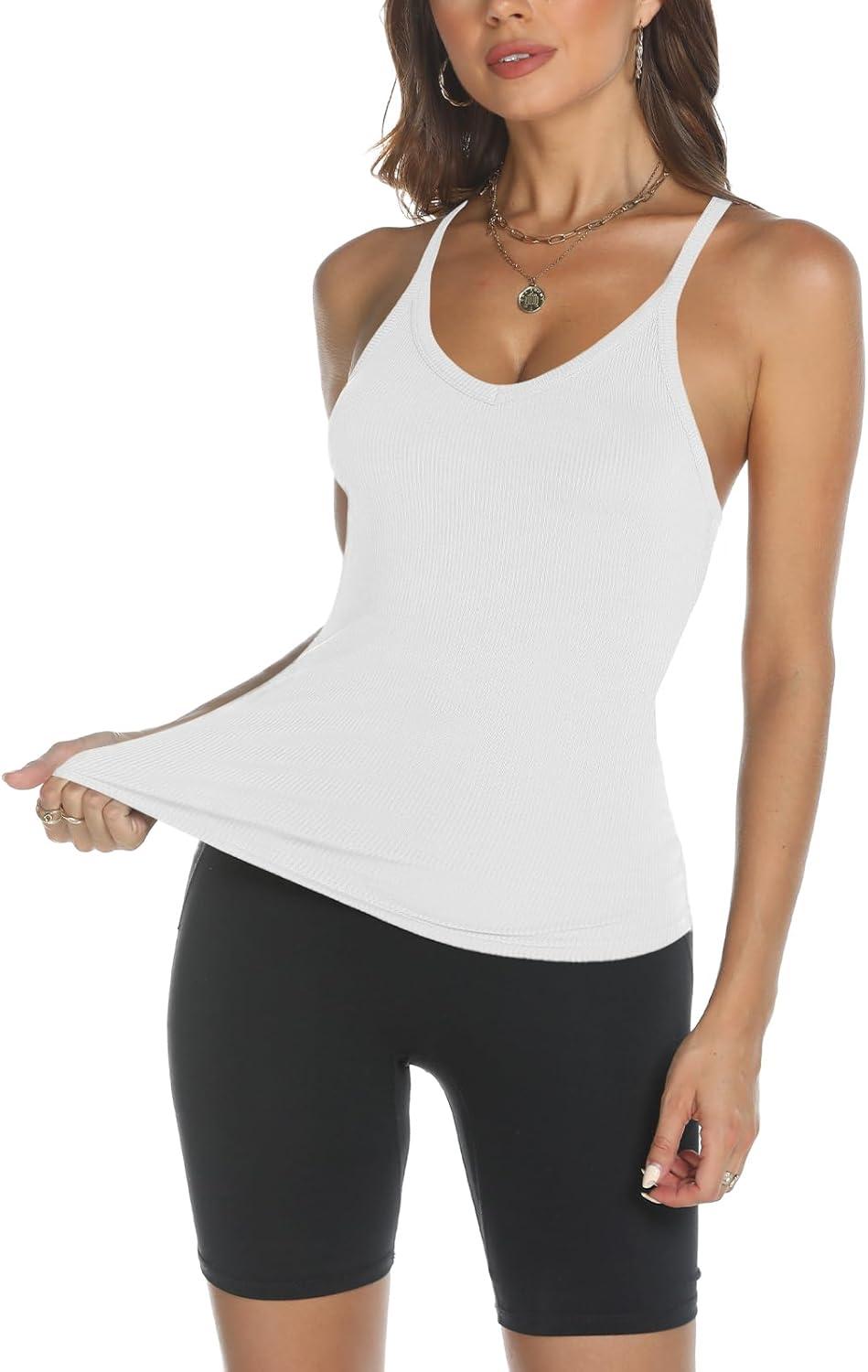 Trendy Queen Womens Workout Tank Tops Racerback Summer 2025 Camisole Top V Neck Ribbed Sleeveless Beach Fashion Clothes(White)